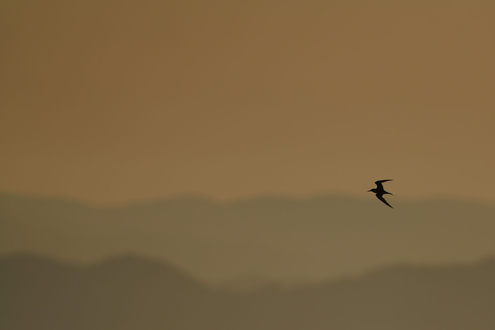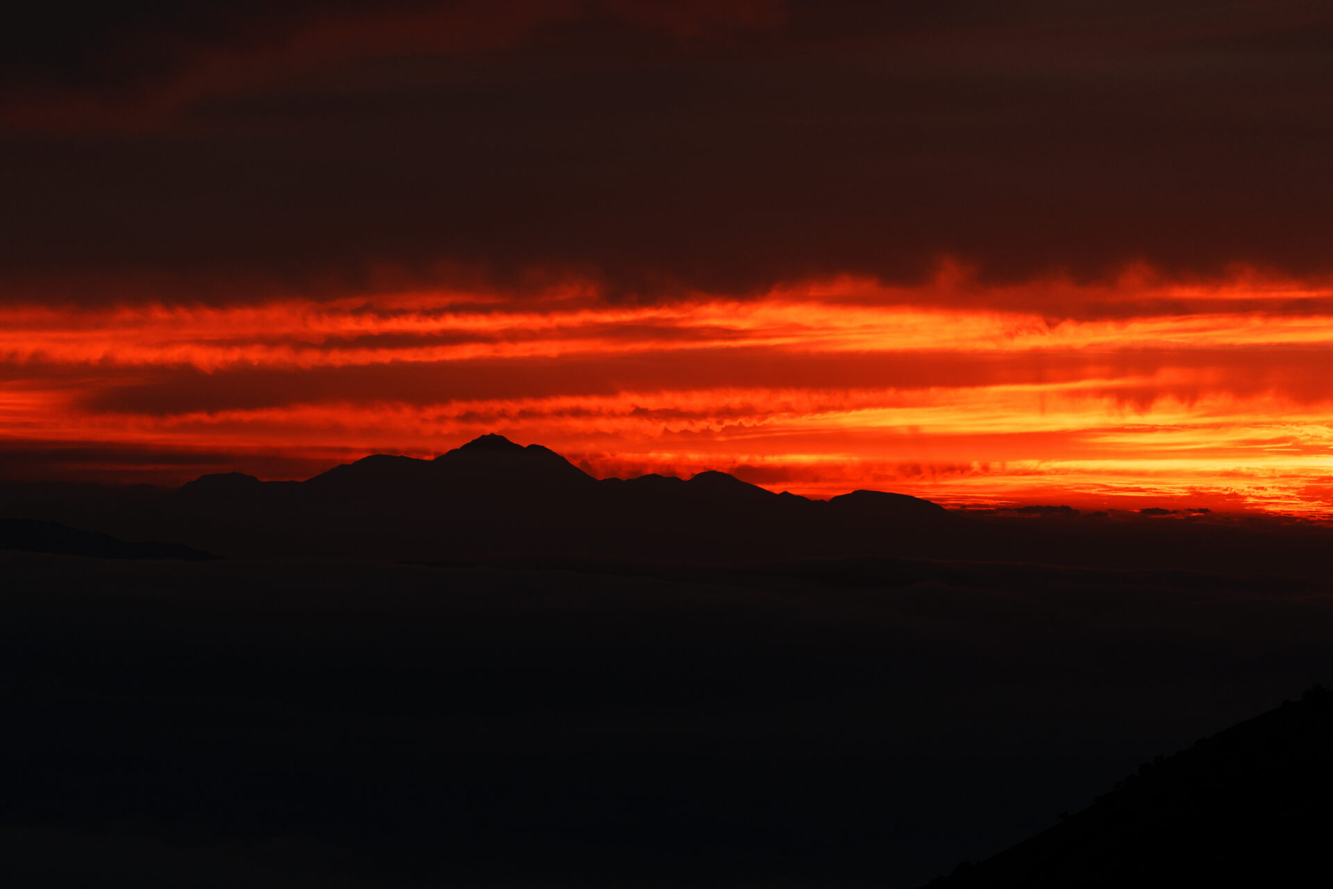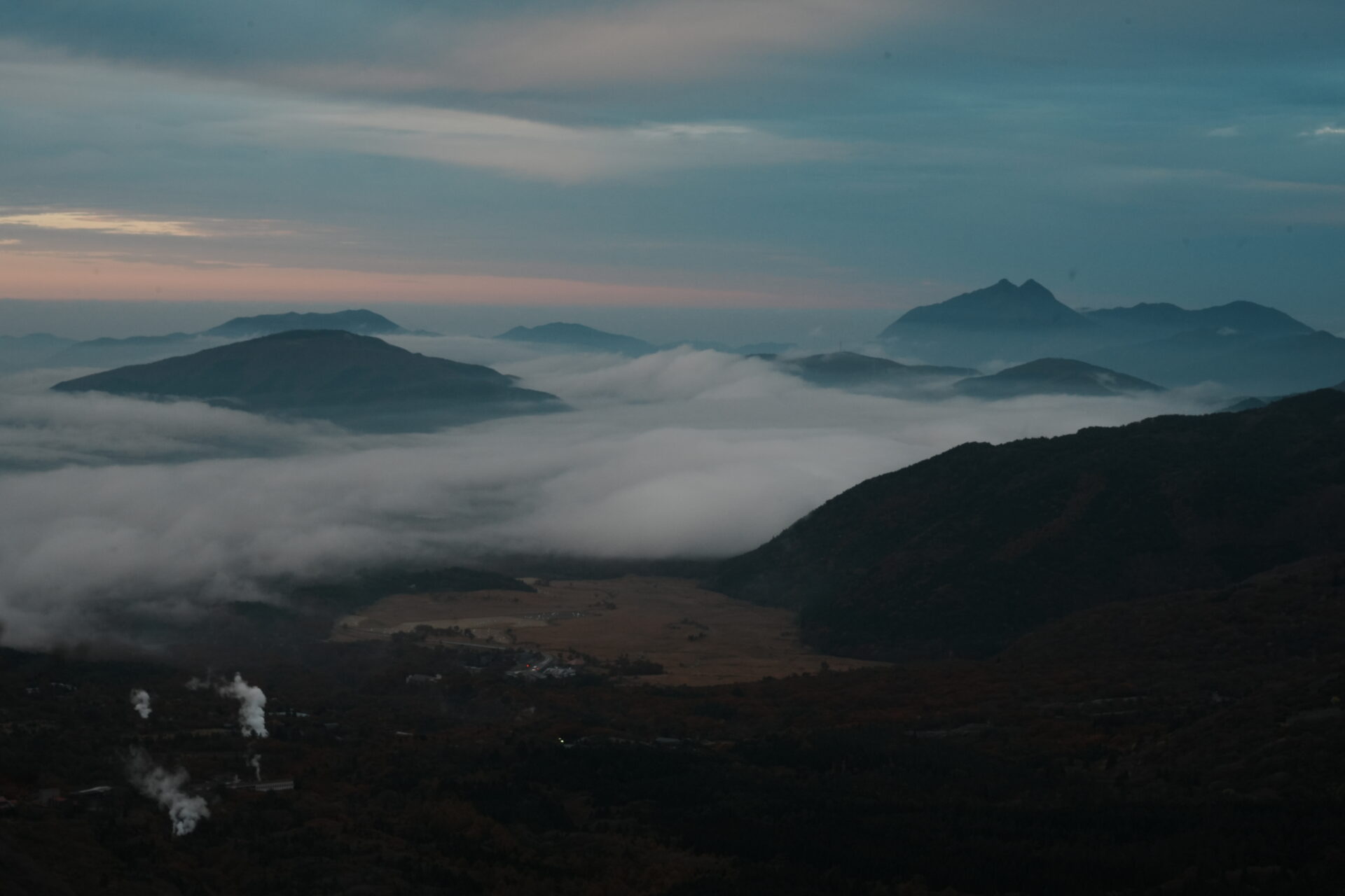 夕暮れ時の遠景はAFでピントが合わないことがよくある。この写真では空に露出を合わせているので山は黒くなっていますが、肉眼では見えています。